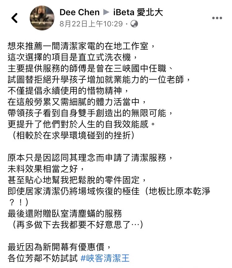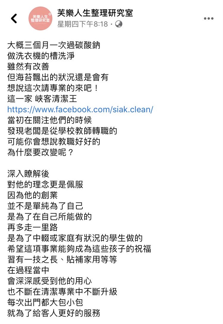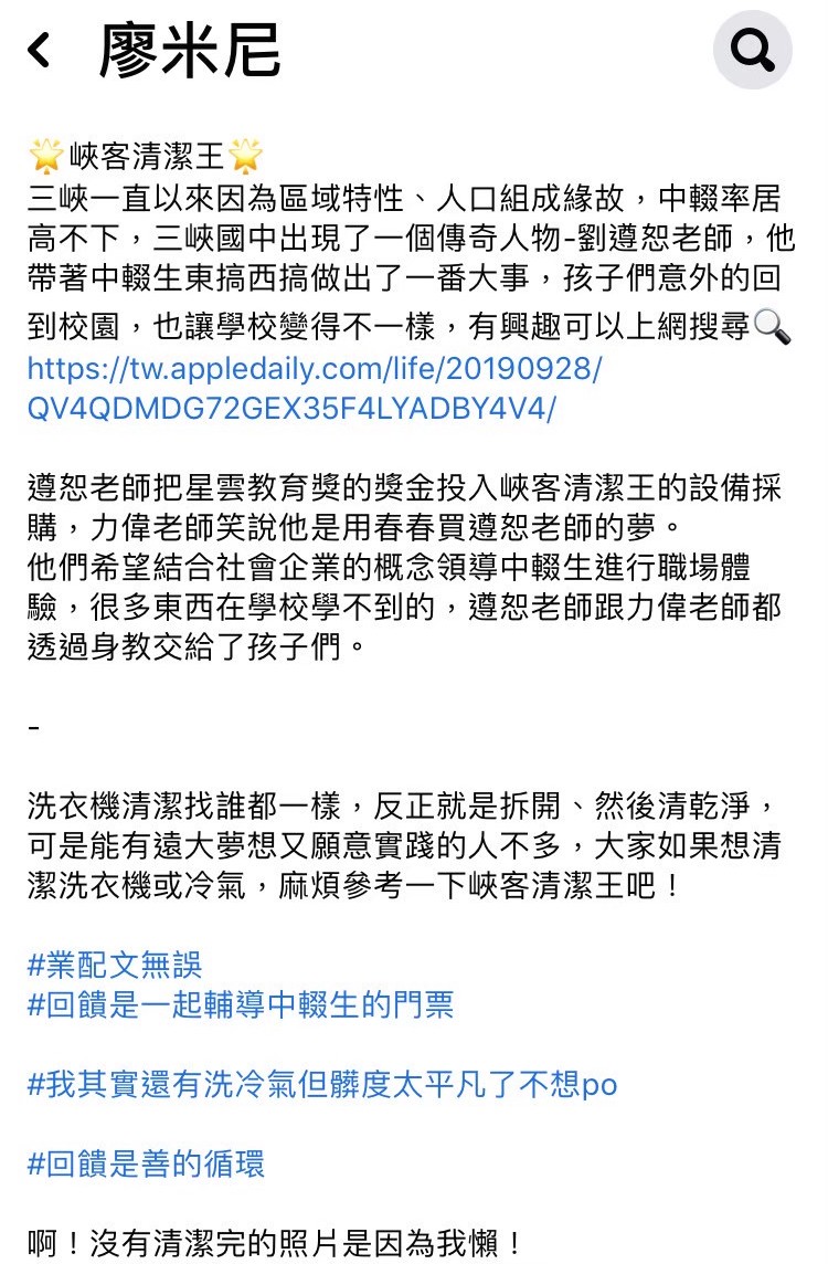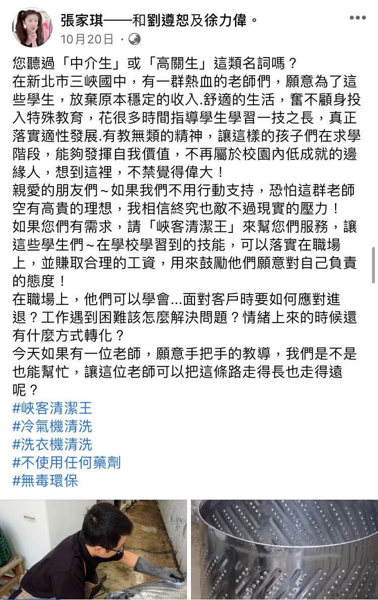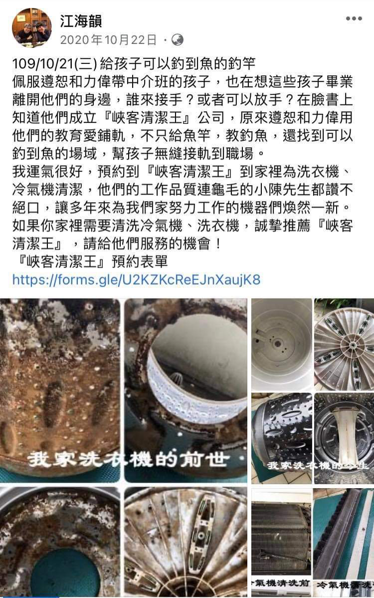兩位在三峽國中共同辦理高關懷教育課程的熱血教師,看過太多畢業前回歸校園的孩子,卻因畢業後無人持續關注而重返迷途。因此創立「峽客清潔王」,期待能打造出一個「職場結合教育」的空間,幫助因家庭、課業或社會因素而學習受挫的青少年,在此建立真正的自信與能力去面對未來的生活。